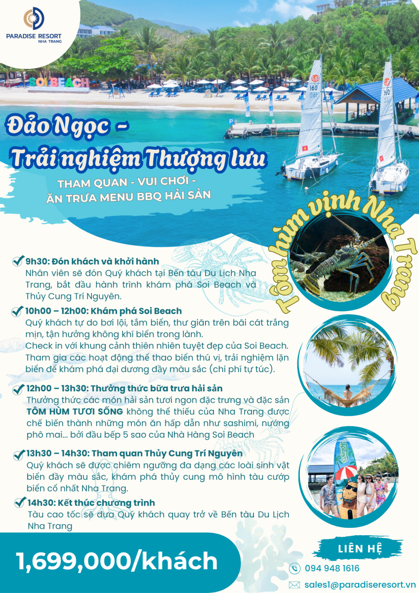 Trải nghiệm – Vui chơi biển – Ăn trưa set menu BBQ hải sản + Tôm Hùm tươi sống – Cano