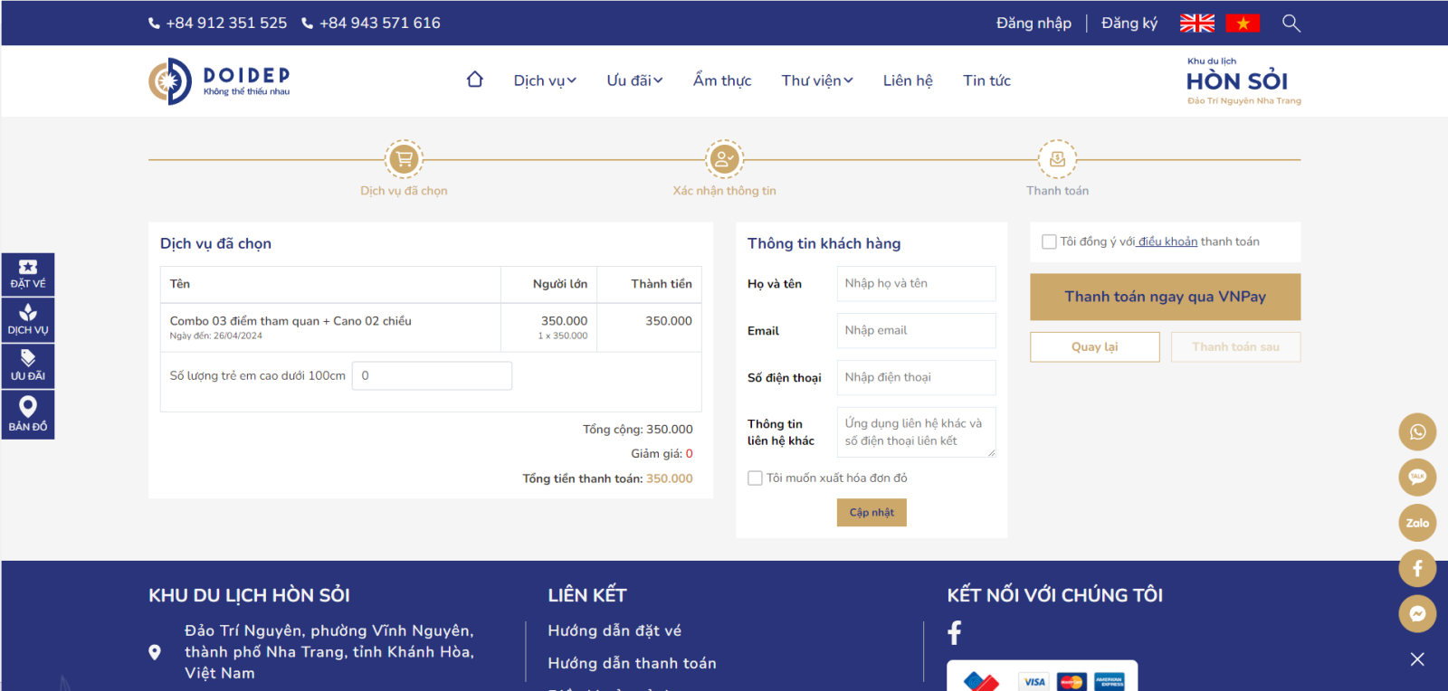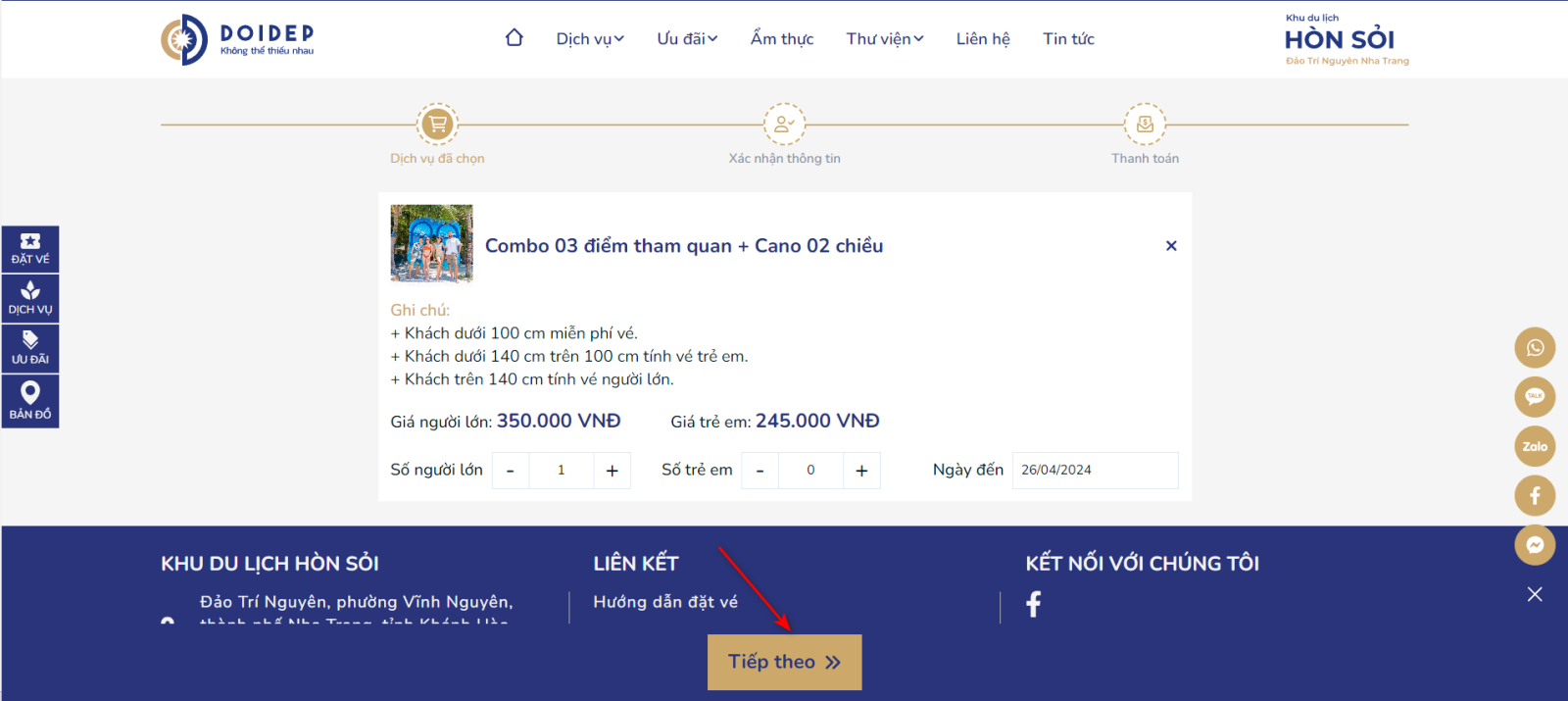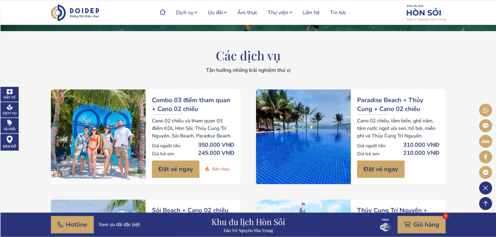 Bước 1: Truy cập trang chủ Hòn Sỏi tại https://honsoi.vn và kéo xuống mục các dịch vụ và chọn dịch vụ muốn đặt. Và chọn vào nút Đặt vé ngay.