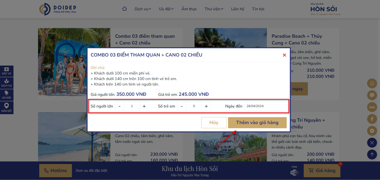 Bước 3: Nhấn vào nút giỏ hàng để xem các dịch vụ đã chọn trước đó. Tại đây bạn có thể chỉnh sửa được số lượng và ngày đến hoặc xóa dịch vụ ra khỏi giỏ hàng trước khi đến bước thanh toán.