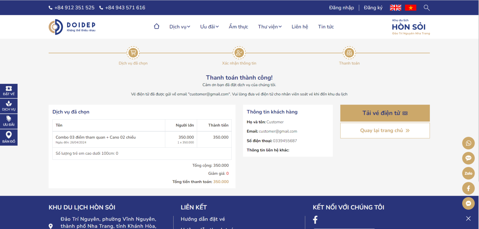 Bước 10: Sau khi thanh toán thành công bạn sẽ được chuyển hướng đến trang thanh toán thành công và hiện thị lại thông tin vé của bạn. Đồng thời hệ thống đã gửi vé đến địa chỉ email của bạn. Trong trường hợp bạn chưa nhận vé bạn cũng có thể nhấn và nút Tải vé điện tử để nhận vé.